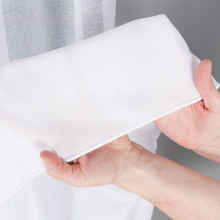 Biela záclona so strieborným prúžkom a olovkom v spodnej časti