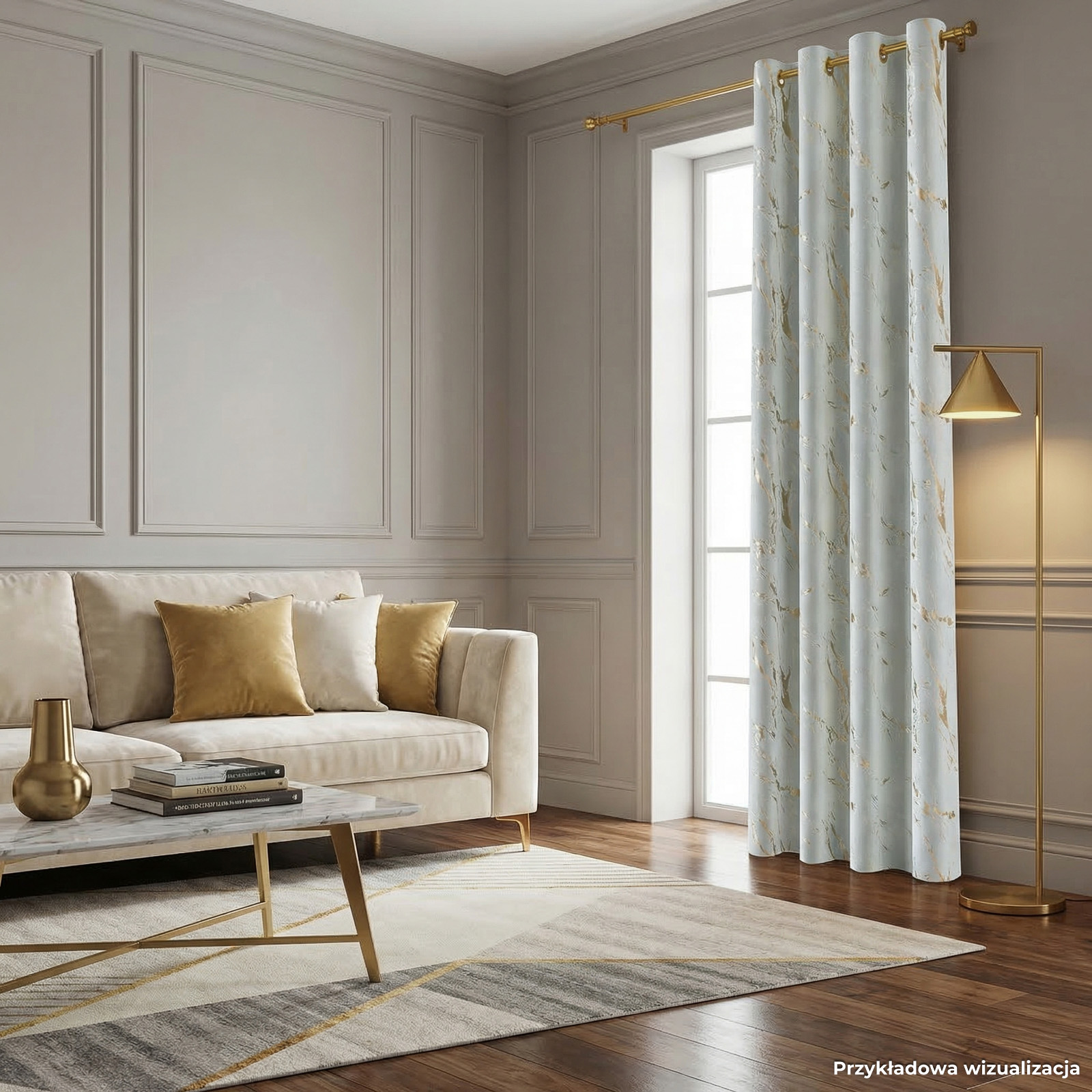 Vyrobený zo zamatového materiálu s jemnou zlatou potlačou, je spojením elegancie a modernosti. Záves má 8 kovových očiek.