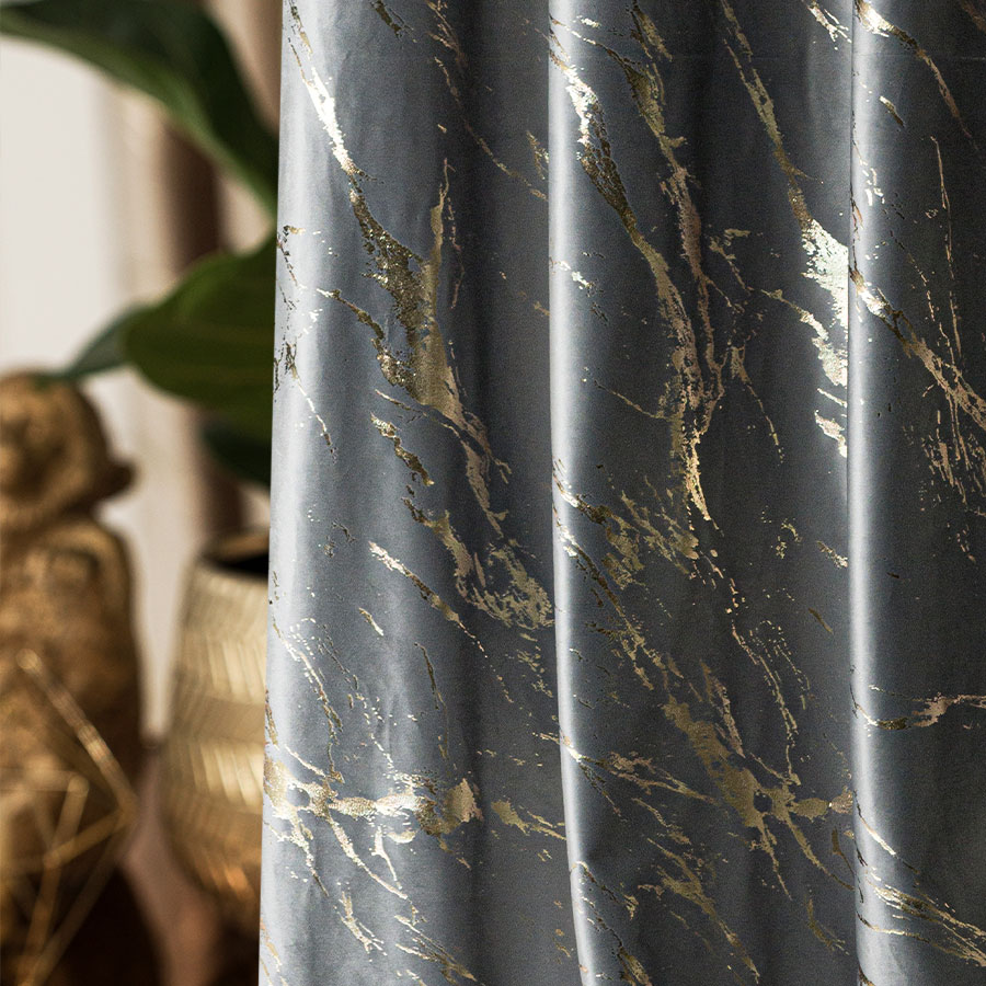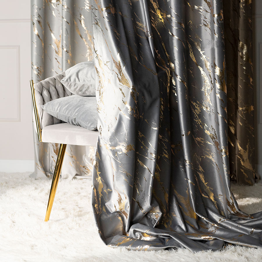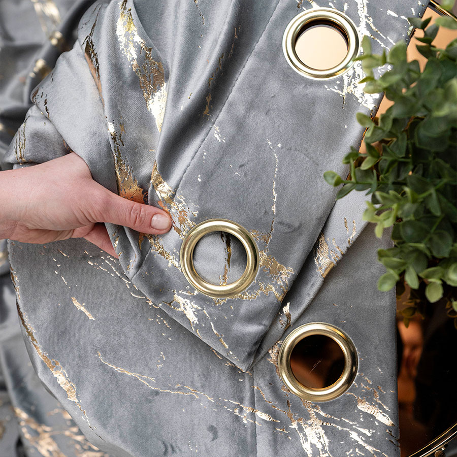 Vyrobený zo zamatového materiálu s jemnou zlatou potlačou, je spojením elegancie a modernosti. Záves má 8 kovových očiek.