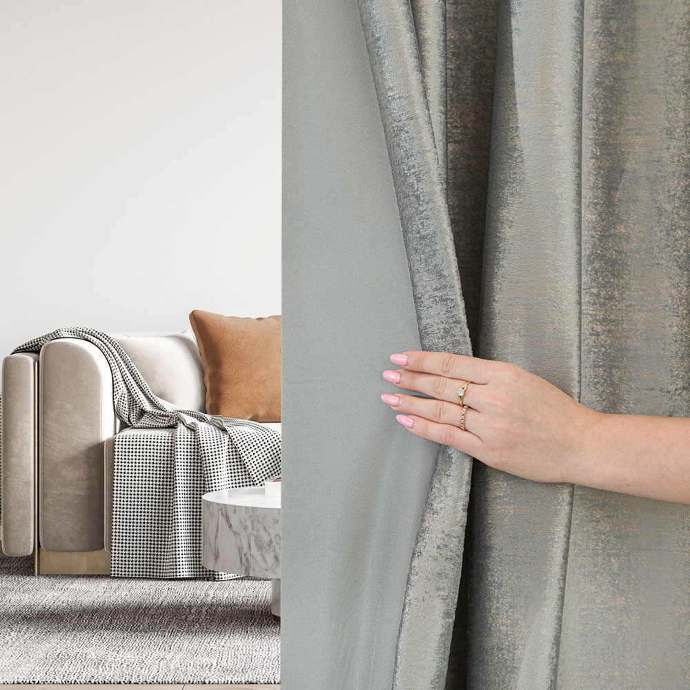 Vyrobený zo zamatového materiálu s jemnou zlatou trblietavou potlačou, je spojením elegancie a modernosti. Záves má 8 kovových očiek v striebornom chróme.