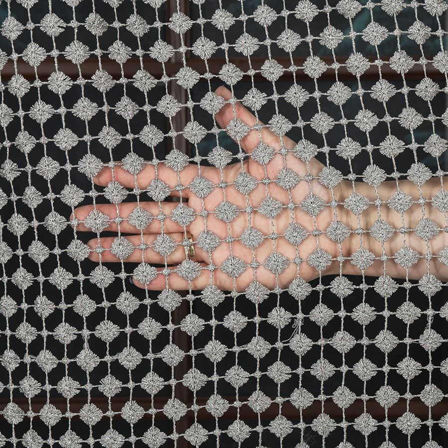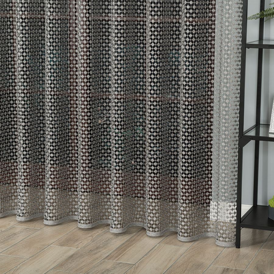 Záclona krajková sivá farba s lurexom výška 280 cm určená na závesy a obrusy
